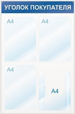 Информационный настенный стенд предназначен для размещения информации на трех листах формата А4, а также брошюры формата А4 в вертикальном положении. Изготовлен из пластика белого цвета толщиной 4 мм. 3 плоских кармана — прозрачный пластик толщиной 0,5 мм, 1 объемный карман — акрил толщиной 2 мм. Аппликация букв сделана синей пленкой. Стенд укомплектован необходимым крепежом.