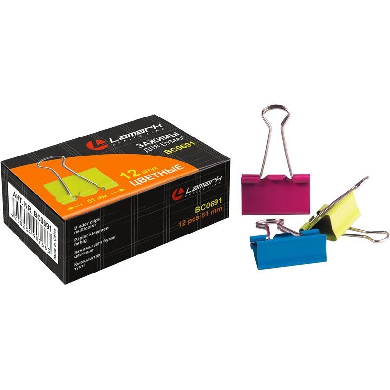 Зажимы для бумаг 51мм 12шт Lamark цветные в картонной коробке