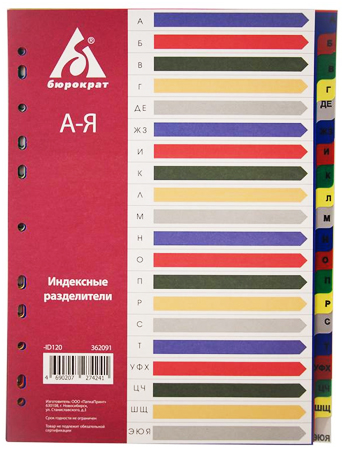 Цветные алфавитные разделители из полипропилена помогут вам найти нужный документ в считанные секунды, организовать работу, сделать ее легче и приятнее. Они предназначены для создания абсолютного порядка при хранении и систематизации ваших документов. Универсальная перфорация позволяет использовать разделитель, как в папках-файл, так и в папках на кольцах. На титульном листе размещена информация о количестве разделов.