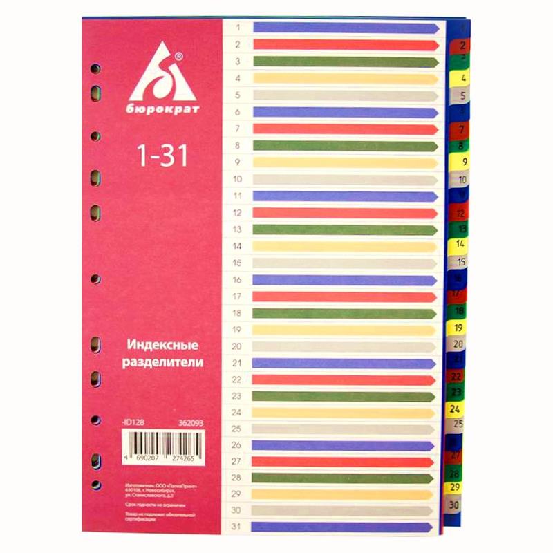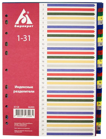 Цветные цифровые разделители из полипропилена помогут вам найти нужный документ в считанные секунды, организовать работу, сделать ее легче и приятнее. Они предназначены для создания абсолютного порядка при хранении и систематизации ваших документов. Универсальная перфорация позволяет использовать разделитель, как в папках-файл, так и в папках на кольцах. На титульном листе размещена информация о количестве разделов.