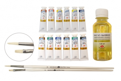 Состав набора: масло льняное рафинированное отбеленное в банке (120 мл); кисти Невская палитра из щетины с длинной ручкой (плоская №2 и круглая №3); краски масляные 12цв х18мл в тубах (белила цинковые или титановые; кадмий лимонный (А); кадмий желтый светлый (А) или средний (А); кадмий красный светлый (А) или темный (А); охра красная или английская красная или индийская красная; кобальт синий средний (А) или голубая «ФЦ» или кобальт синий светлый (А); ультрамарин светлый; кобальт зеленый темный (А) или светлый (А); виридоновая зеленая или зеленая «ФЦ»; сиена натуральная или охра светлая или охра золотистая; умбра натуральная ленинградская или умбра жженая или сиена жженая; сажа газовая или шунгит).