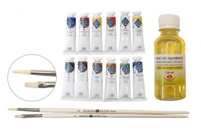 Состав набора: масло льняное рафинированное отбеленное в банке (120 мл); кисти Невская палитра из щетины с длинной ручкой (плоская №2 и круглая №3); краски масляные 12цв х18мл (белила цинковые или титановые; кадмий желтый светлый или средний; неаполитанская желтая или стронциановая желтая; кадмий красный светлый или темный; английская красная или индийская красная; ультрамарин светлый; голубая «ФЦ»; кобальт зеленый светлый или темный; охра золотистая или сиена натуральная; умбра жженая или сиена жженная; марс коричневый светлый или темный; марс черный или сажа газовая).