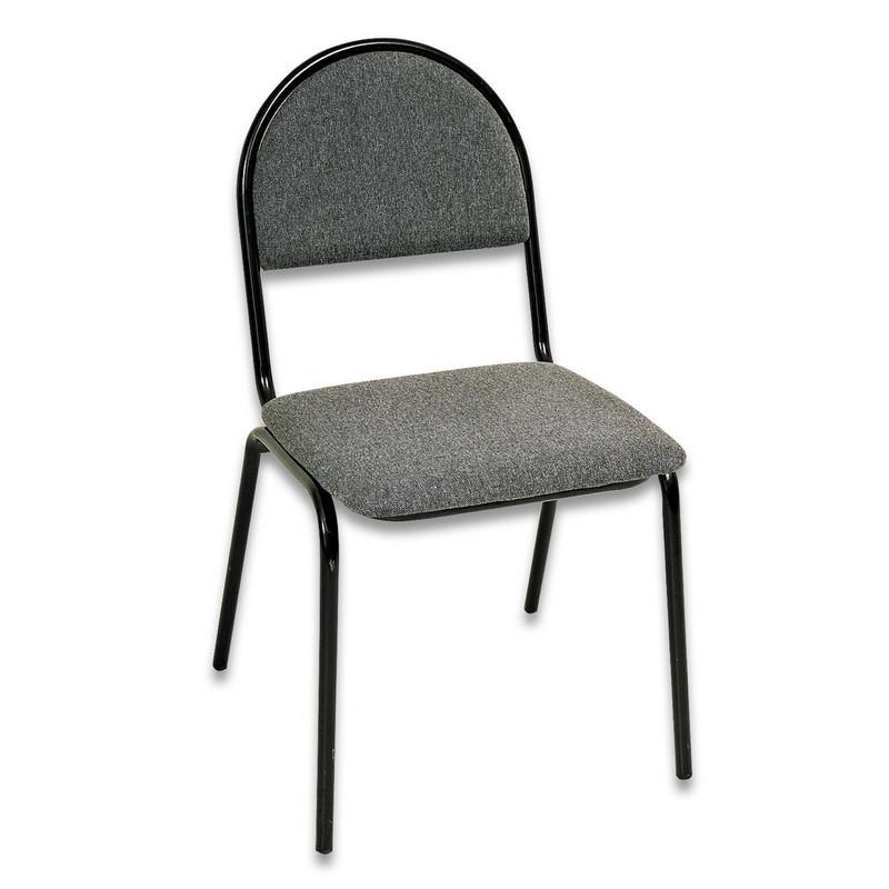 Офисный стул для посетителей с сиденьем и спинкой, обитыми тканью серого цвета. Каркас выполнен из металла с износостойким напылением черного цвета.