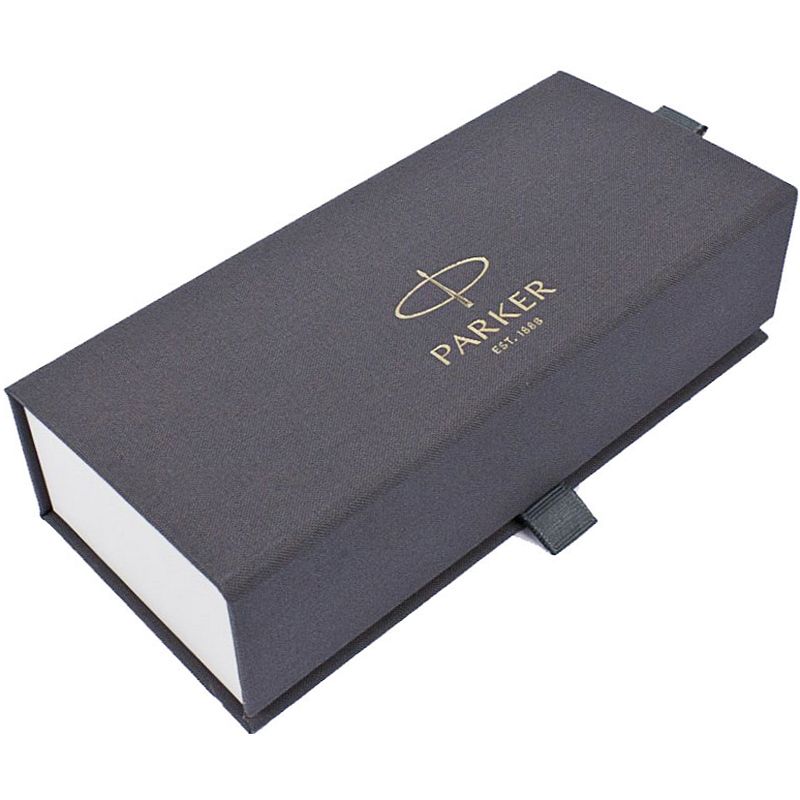 Перо из нержавеющей стали покрыто золотом и украшено традиционной перекрестной гравировкой и надписью Parker. Корпус перьевой ручки выполнен из тщательно отполированной нержавеющей стали, а детали дизайна покрыты золотом; зона захвата изготовлена из высококачественного пластика черного цвета. Ручка поставляется в новой подарочной коробке, которая соответствует основным принципам премиальной упаковки. На боковой стороне коробки нарисованы гербы — подтверждение гарантии Британского Королевского двора.
