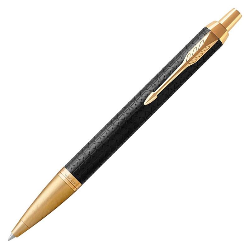 Шариковая ручка из обновленной коллекции IM Premium 2017 года. Основные особенности нового дизайна: новый зажим-стрела с тремя широкими перьями, укороченная форма торца на колпачке, широкое кольцо на корпусе теперь состоит из 3 соединенных вместе колец, на среднем выполнена гравировка логотипа Parker. Корпус шариковой ручки выполнен из черного матового анодированного алюминия, прошедшего пескоструйную обработку, с фирменной гравировкой в виде стильного графического орнамента, отдельные детали дизайна позолочены. Ручка поставляется в престижной подарочной коробке с обновленным дизайном.