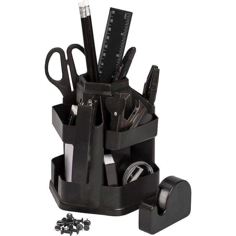 Настольный набор изготовлен из пластика черного цвета. Имеет вращающуюся на 360 градусов основу.