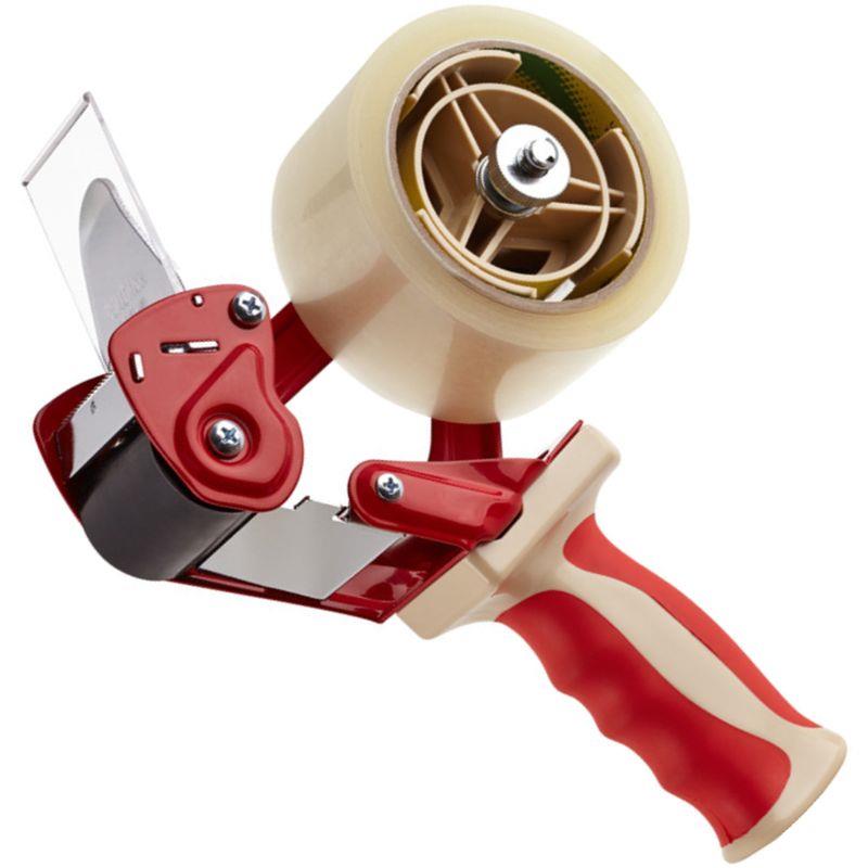Диспенсер предназначен для клейкой упаковочной ленты шириной 50 мм. Корпус металлический, рукоятка пластиковая. Прорезиненная ручка предотвращает скольжение руки при работе. Имеет выдвижной нож и винт регулировки натяжения ленты. Основные рабочие узлы изготовлены из металла, что увеличивает прочность изделия и дает возможность использовать ленту до 200 метров. Клейкая упаковочная лента в комплект не входит.