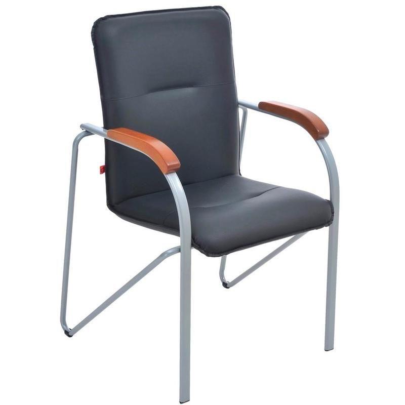 Конференц-стул подходит для конференц-залов, для приема посетителей в офисе, для дома. Обито искусственной кожей черного цвета. Каркас выполнен из серебристого металла, оснащен накладками для сохранности напольного покрытия. На подлокотниках — деревянные вставки цвета вишня.