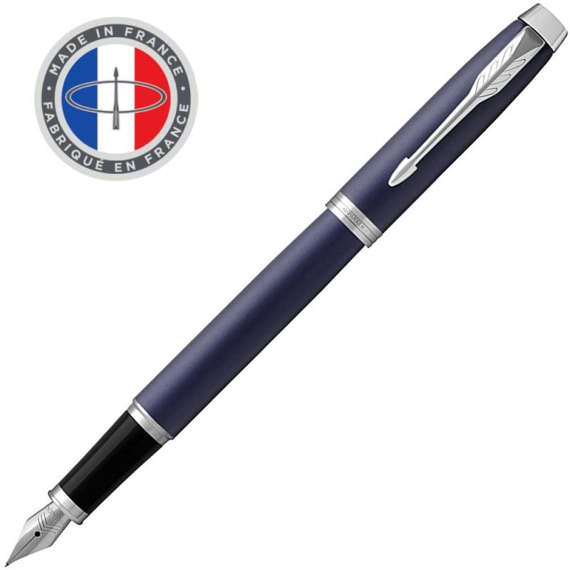 Перьевая ручка из обновленной коллекции IM 2017 года. Основные особенности нового дизайна: новый зажим-стрела с тремя широкими перьями, укороченная форма торца на колпачке, широкое кольцо на колпачке теперь состоит из 3 соединенных вместе колец, на среднем выполнена гравировка логотипа Parker. Корпус перьевой ручки выполнен из латуни и покрыт многослойным матовым лаком темно-синего цвета, отдельные детали дизайна покрыты хромом, зона захвата изготовлена из блестящего пластика. Перьевая ручка оснащается пером из нержавеющей стали в новой привлекательной форме. Ручка поставляется в престижной подарочной коробке с обновленным дизайном, в комплекте также присутствует один пробный картридж и гарантийный талон.