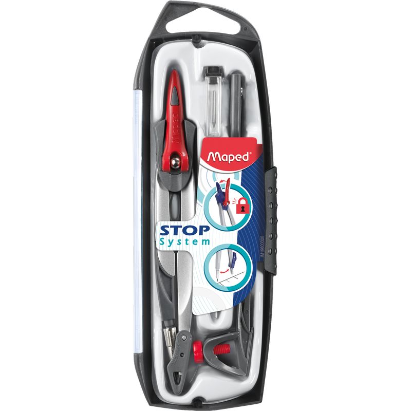 Эксклюзивная инновация, запатентованная Maped — концепция Stop System фиксирует штанги в нужном положении. Поднимите рычаг, установите нужный радиус, опустите рычаг для фиксации штанг и начертите окружность. Безопасная игла. Ударопрочный футляр. Состав: циркуль металлический Stop System 14см с грифелем 2мм, запасной грифель, универсальный держатель для карандаша/рапидографа, насадка с автоматическим карандашом 0.5 мм, точилка для грифелей.