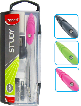 Состав: циркуль металлический Study 12см с грифелем 2мм, запасной грифель, точилка для грифелей, отвертка, ластик.