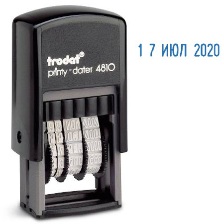 Дата устанавливается вручную. Датер имеет надежный пластиковый корпус с пружинным механизмом и встроенной сменной подушкой синего цвета. Окрашенный оттиск получается автоматически при нажатии на корпус.