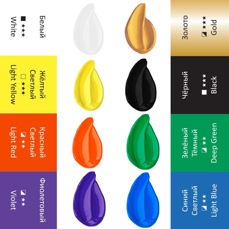 Состав набора: белая, желтая светлая, красная светлая, фиолетовая, синяя светлая, зеленая темная, черная, золото.