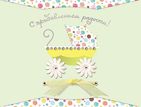 Внутри: Ваша радость: ___кг ___см. Привет, кроха! Отделка: Холодное фольгирование, конгрев, термоблестки, стразы, цветочки со стразой, пикколо, капроновая лента. Упаковка: Жёлтый конверт Отделка: выборочный УФ-лак, холодная фольга