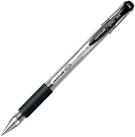 В гелевых ручках Signo применяются чернила только на пигментной основе, которые не смываются водой, не выцветают. Для идеальной подачи таких чернил UNI применяет двух-шариковый наконечник: когда ручка направлена вниз наконечником и пишет по бумаге, чернила свободно проходят по каналу для подачи чернил, а когда наконечник направлен вверх, чернила не стекают в стержень, благодаря второму шарику. Комфортная зона захвата для пальцев.
