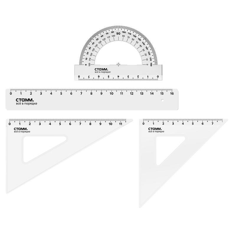 набор содержит линейку 16см, треугольник 7см 45°, треугольник 11см 30°, транспортир 7см 180°