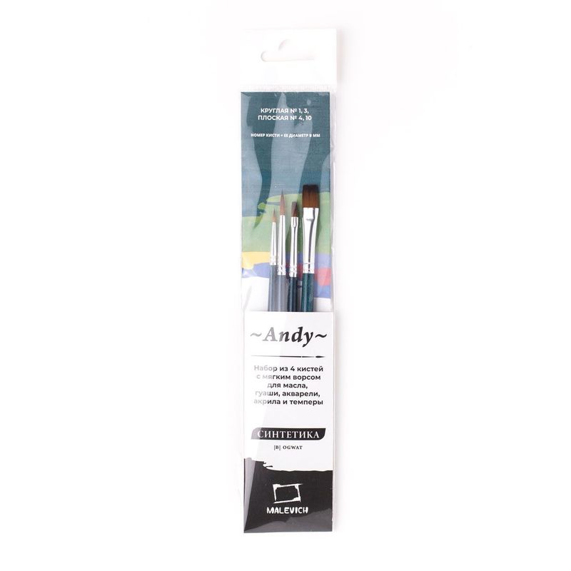 Кисти художественные набор Малевичъ Andy  4шт синтетика круглая №1, 3 плоская №4, 10