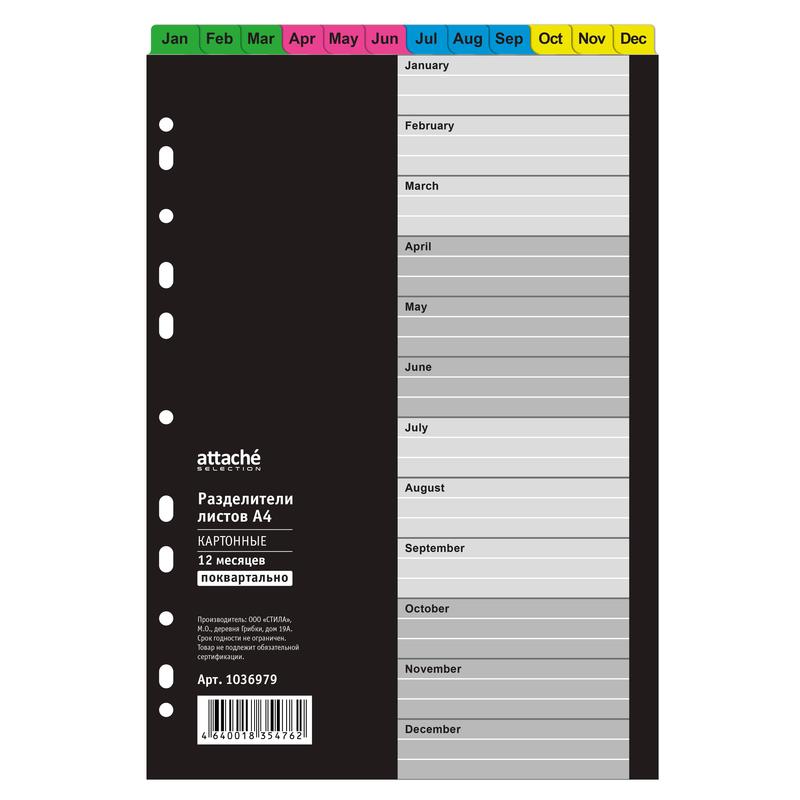 Разделитель листов по месяцам Jan-Dec Attache Selection изготовлены из прочного картона. Универсальная перфорация совместима с различными типами папок.