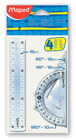 Мини-набор из 4 предметов: линейка 15 см, угольник 60°/12 см, угольник 45°/12 cм, транспортир 180°/10 см.