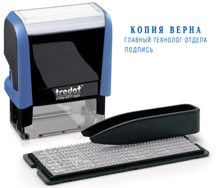 Штамп представляет собой надежный пластиковый корпус с пружинным механизмом, встроенной сменной подушкой синего цвета и рифленой текстовой площадкой, на которой набирается текст. Окрашенный оттиск получается автоматически при нажатии на корпус.