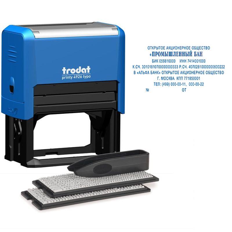 Штамп представляет собой надежный пластиковый корпус с пружинным механизмом, встроенной сменной подушкой синего цвета и рифленой текстовой площадкой, на которой набирается текст.