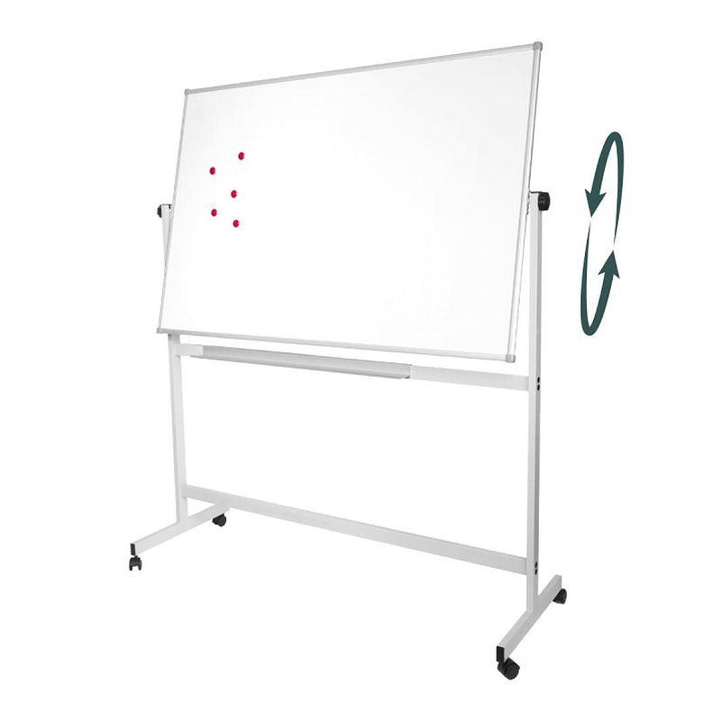 Двусторонняя магнитно-маркерная доска вращающаяся на 360 граусов, на роликах, с лаковым покрытием. Стильная мобильная подставка на 4-х колесиках с механизмом фиксации. Простой и удобный узел фиксации позволяет установить полотно доски под произвольным углом. Стойки имеют поворотные колесные опоры, что позволяет легко перекатить доску.