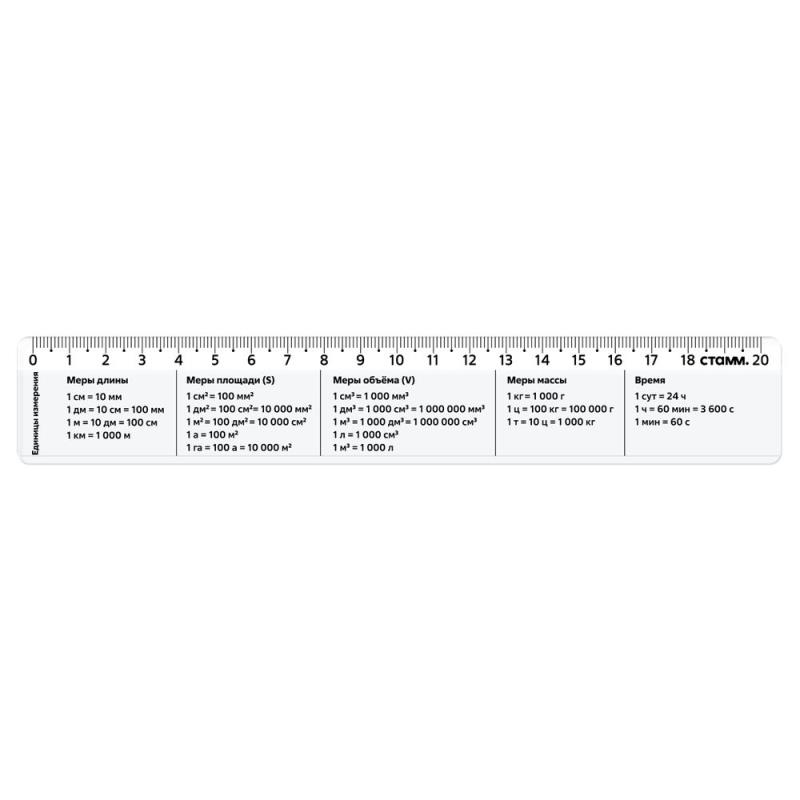 Широкая линейка-шпаргалка с единицами измерения. Чёткое нанесение информации и шкалы делений 20см. Безопасные закругленные углы. Гладкая глянцевая поверхность. Материал: сертифицированный полистирол Размеры: 210х35х2мм Вес: 14г