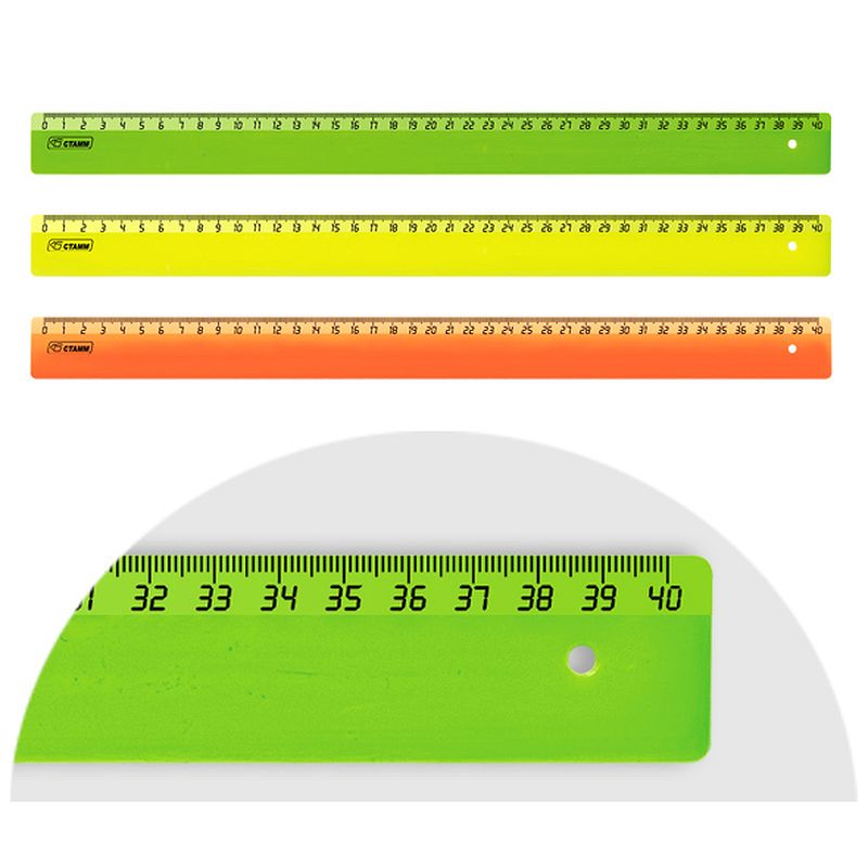 Линейка с ровной чёткой миллиметровой шкалой в 3 ярких неоновых цветах. Безопасные закругленные углы. Гладкая глянцевая поверхность. Материал: сертифицированный полистирол. Размеры: 415х32х3мм Вес: 30гр