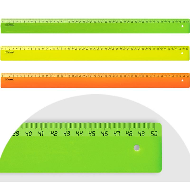 Линейка с ровной чёткой миллиметровой шкалой в 3 ярких неоновых цветах. Безопасные закругленные углы. Гладкая глянцевая поверхность. Материал: сертифицированный полистирол. Размеры: 510х40х3мм Вес: 57г