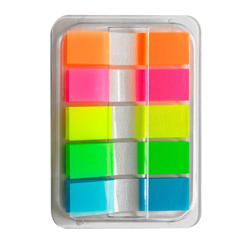 Закладки пластиковые Lamark уложены в диспенсере по Z-принципу. Легко извекаются и строго по одной. В диспенсере пять цветов неон по 20 листов.