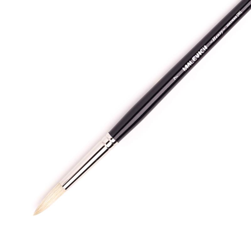 Кисти серии Анри производятся из натуральной свиной щетины самого высокого качества. Благодаря расщепленному кончику кисть хорошо впитывает и разносит краску. Короткая выставка позволяет делать короткие, упругие мазки и работать с густой краской. Кисть на классической длиной ручке из березы покрытой черным лаком, обойма из латуни с покрытием никель-хром. Кисти идеальны для пастозной живописи маслом и акрилом. Номер кисти соответствует диаметру в мм.Кисть щетина круглая Малевичъ Анри № 2 ручка 18см_10шт/уп