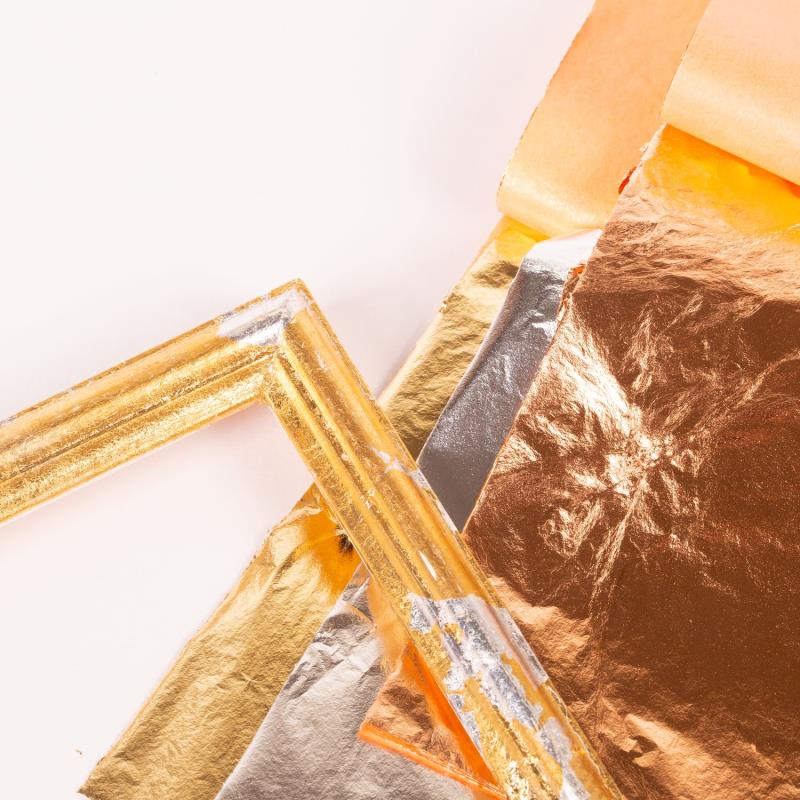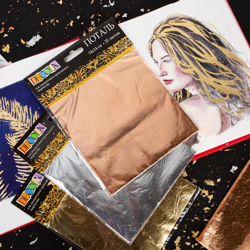 Поталь листовая в книжке, 25 листов, 14х14 см. Благодаря размещению листов потали в книжке, работать с ней удобно. В этом случае художнику не нужна специальная кисть-лампензель для переноса листа на рабочую поверхность. Лист берется вместе с бумагой, обрезается при необходимости ножницами и переносится на объект.