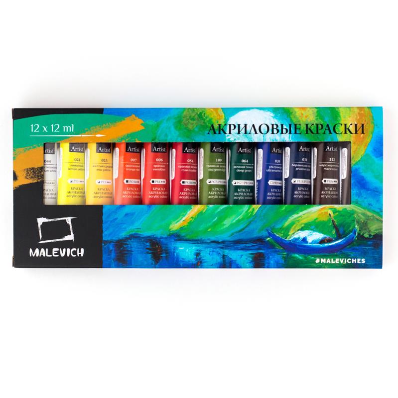 Краски акриловые художественные Малевичъ 12цв х12мл в картонной коробке