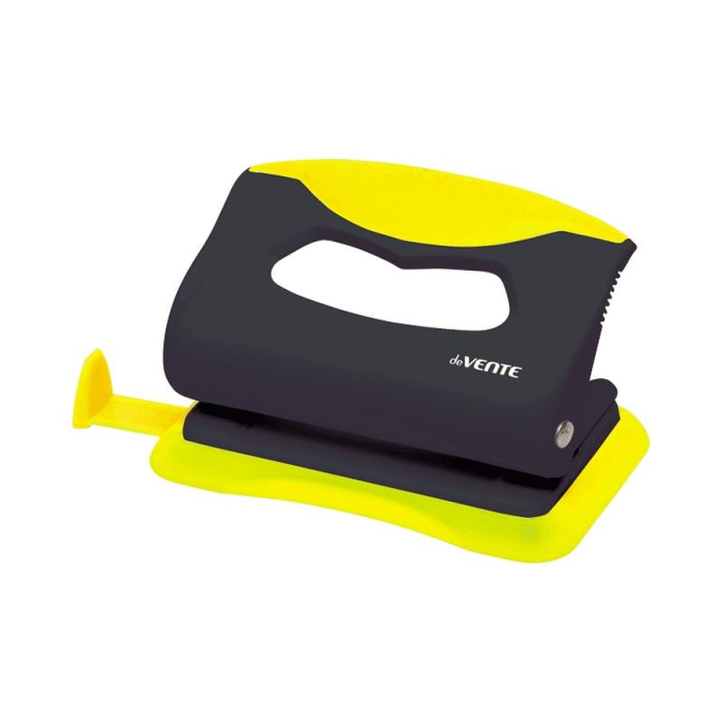 Дырокол с пластиковым корпусом и каучуковой вставкой оснащен линейкой со шкалой и съемным поддоном для конфетти.