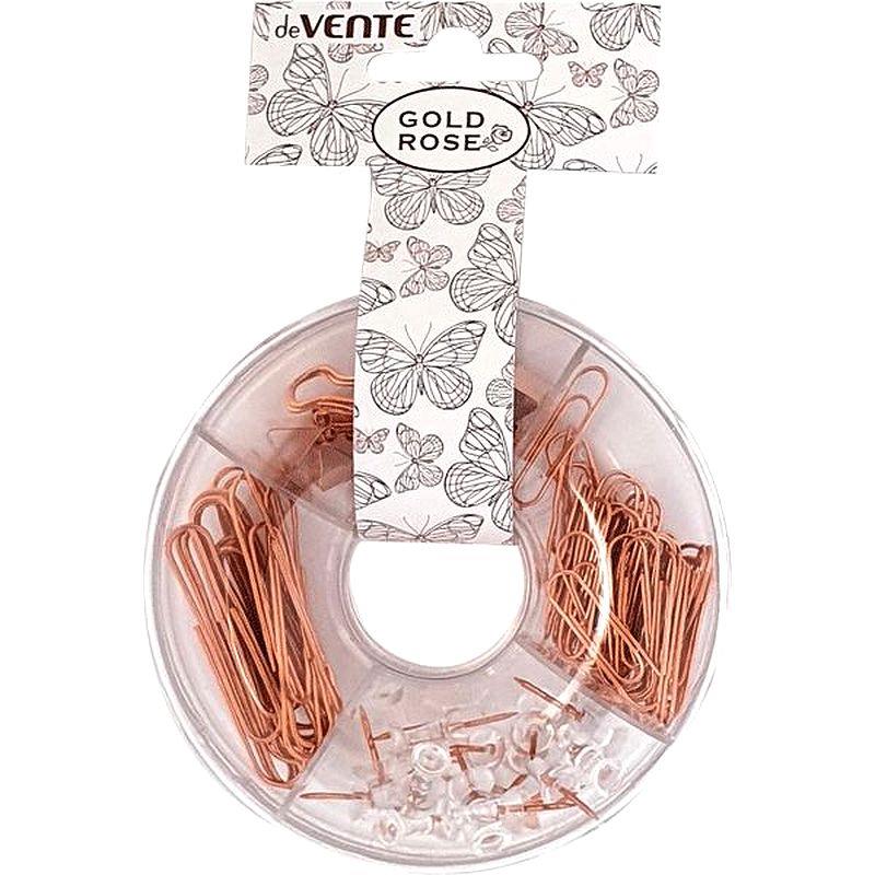 Состав набора розовое золото: зажимы для бумаг 19мм – 4шт, гвоздики для досок – 20шт, скрепки 50мм – 15шт, скрепки 28мм – 50шт.