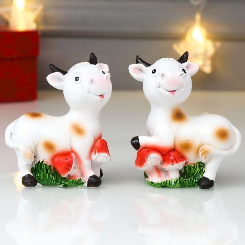Сувенир новогодний 'Бычок пятнистый на лужайке с грибами' ассорти полиустоун 8.5х4.5х7.5см