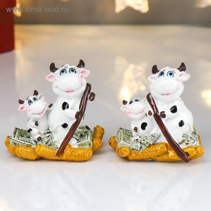 Сувенир новогодний 'Бычок пятнистый с малышом на денежном плоту' ассорти полиустоун 7х8х4см