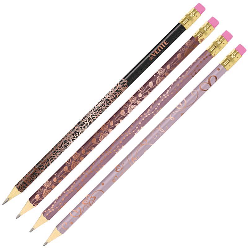 Заточенный чернографитный круглый карандаш с ластиком. Цвета корпуса ассорти - 3 цвета металлик и 1 черный матовый с тиснением дизайна на корпусе золотистой фольгой.