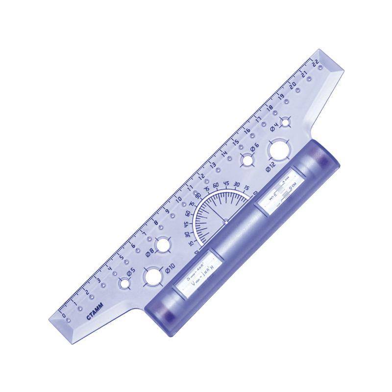 Равномерно перемещается по бумажной поверхности. Содержит транспортир 180 градусов и трафареты окружностей. Ровное четкое нанесение шкалы и информации. Прозрачная бесцветная. Материал: сертифицированный полистирол Размеры: 66х242х24мм Вес: 40г
