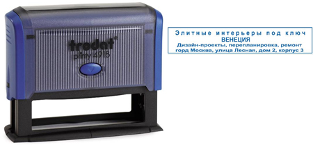Оснастка для штампа представляет собой надежный пластиковый корпус с пружинным механизмом и встроенной сменной подушкой синего цвета. Оснастка имеет прямоугольную площадку размером 75х15 мм для наклеивания готового текстового клише. Окрашенный оттиск получается автоматически при нажатии на корпус оснастки. Прямоугольные оснастки используются для маркировки бухгалтерских документов, каталогов, проспектов.