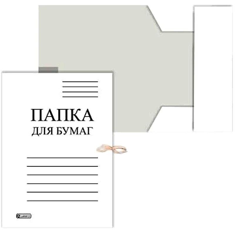 Папка для бумаг формата А4 с завязками изготовлена из мелованного картона белого цвета. На лицевой стороне есть поля для подписывания. Три внутренних клапана надежно удерживают документы.