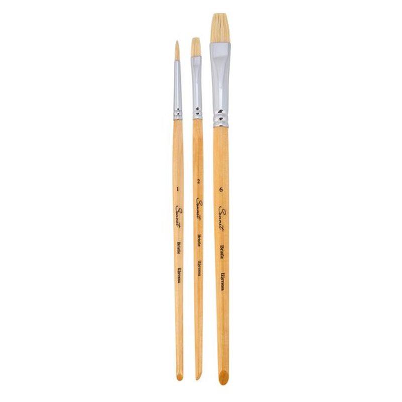 Набор кистей из щетины с короткой ручкой. Плоские кисти используются для нанесения широких ровных мазков. Благодаря густоте и длине волоса, кисть удерживает много краски. Круглая кисть используется для создания рисунка и фактуры, работы над деталями.