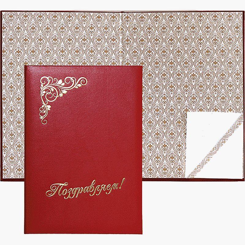 На обложку методом тиснения золотой фольгой нанесена надпись 'Поздравляем' и виньетка.