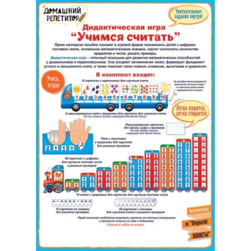 В наборе – несколько полей с прорезями: «Автобус», «Паровозик», «Ладошки», поле с клетками и карточки с картинками, цифрами, точками и знаками. Карточки легко вставляются в прорези. В наборе есть инструкция с заданиями разного уровня сложности.
