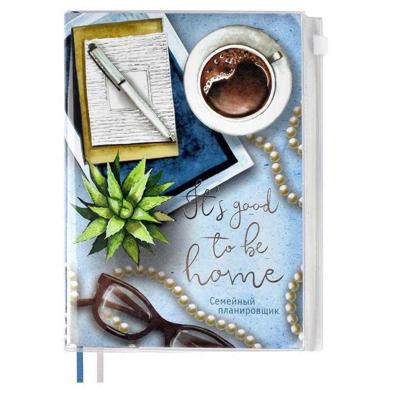 Мягкий переплёт, материал обложки: ПВХ, металлизированная бумага; способ крепления блока: ниткошвейный; вн. блок: 112 л., белый офсет 70 г/м2, полноцветная печать (линия), закладка/-и: два ляссе; форзац: печать пантоном; особенности: вырубка блока по месяцам, карманы для визиток и документов, петля для ручки, съёмная обложка, функциональный карман на молнии как часть задней обложки; индивидуальная упаковка: ПЭТ-пакет