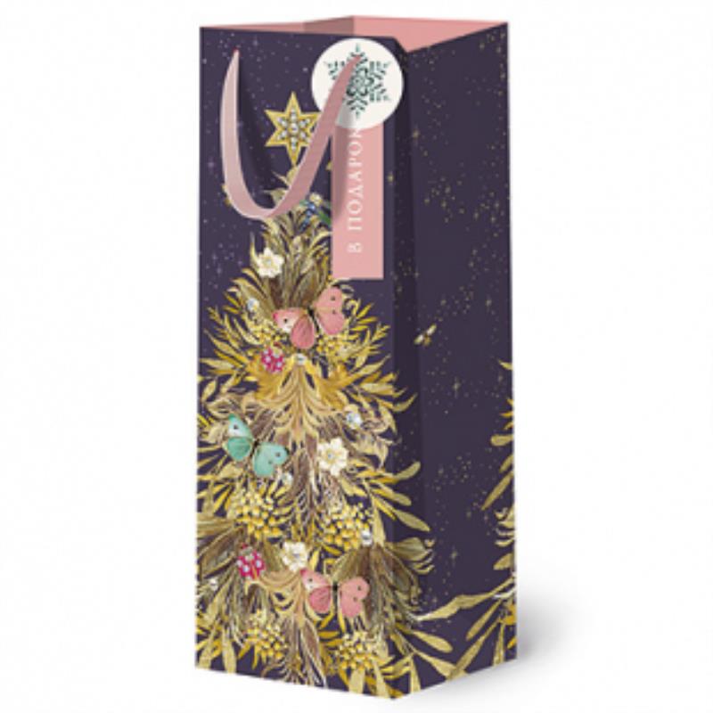 Металлизированная ламинация, выборочный УФ-лак, деталь-бирка, блёстки в лаке, атласная лента