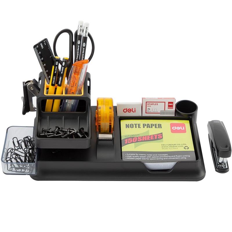 Состав набора: подставка для пишущих предметов с отделами для мелкоофисных принадлежностей, линейка, ножницы, нож канцелярский, степлер, антистеплер, клейкая лента, скобы, две ручки, два карандаша, скрепки, ластик, клейкие листочки, гвоздики.