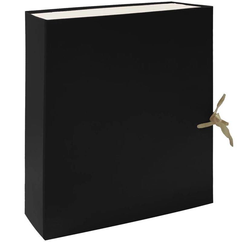 Складной архивный короб, изготовленный из экологически чистого и пригодного для переработки картона, фиксируется в закрытом виде с помощью двух хлопчатобумажных завязок.