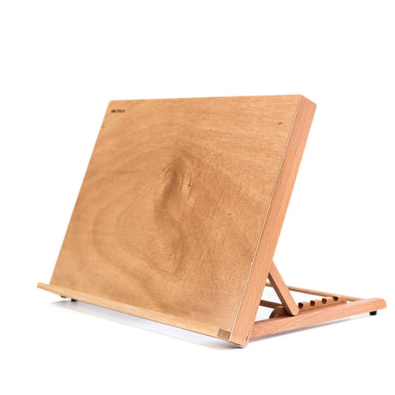 Настольный мольберт-планшет складной с регулируемым углом наклона. Отлично подходит для акварели и пастели. На мольберте можно закрепить бумагу малярным скотчем или зажимами. Выполнен из промасленного бука..