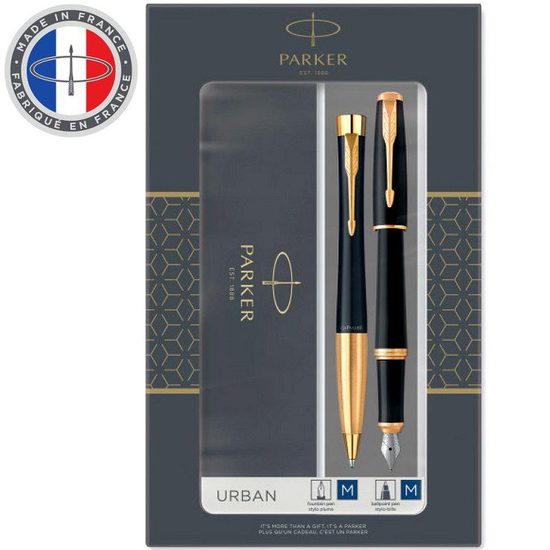 Набор состоит из Перьевой ручки Parker Urban Core 2017 Muted Black GT F309 перо Medium с чернильным картриджем синего цвета, шариковой ручки Parker Urban Muted Black GT со стержнем синего цвета Medium, подарочной коробки на две ручки